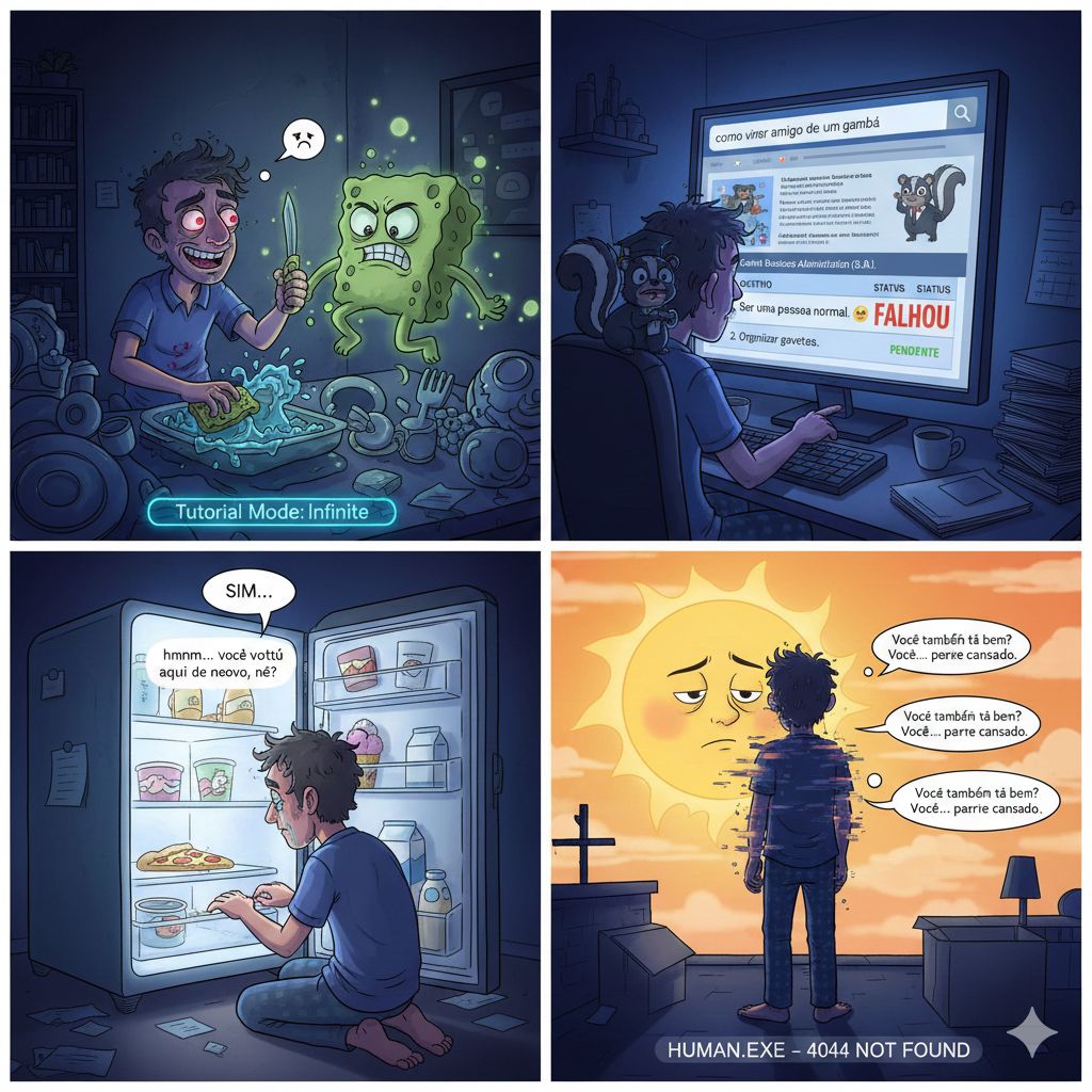 Tipo, 2h da manhã eu tô lavando a louça sorrindo igual um psicopata, porque já passei da fase da sanidade e entrei direto no modo tutorial infinito.