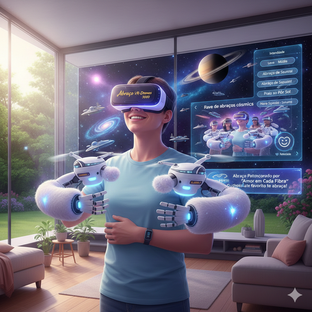 Pacotes VIP incluem sincronização em grupo: você e seus amigos recebem abraços simultâneos de drones, em realidades virtuais conectadas, como uma rave de abraços cósmicos.